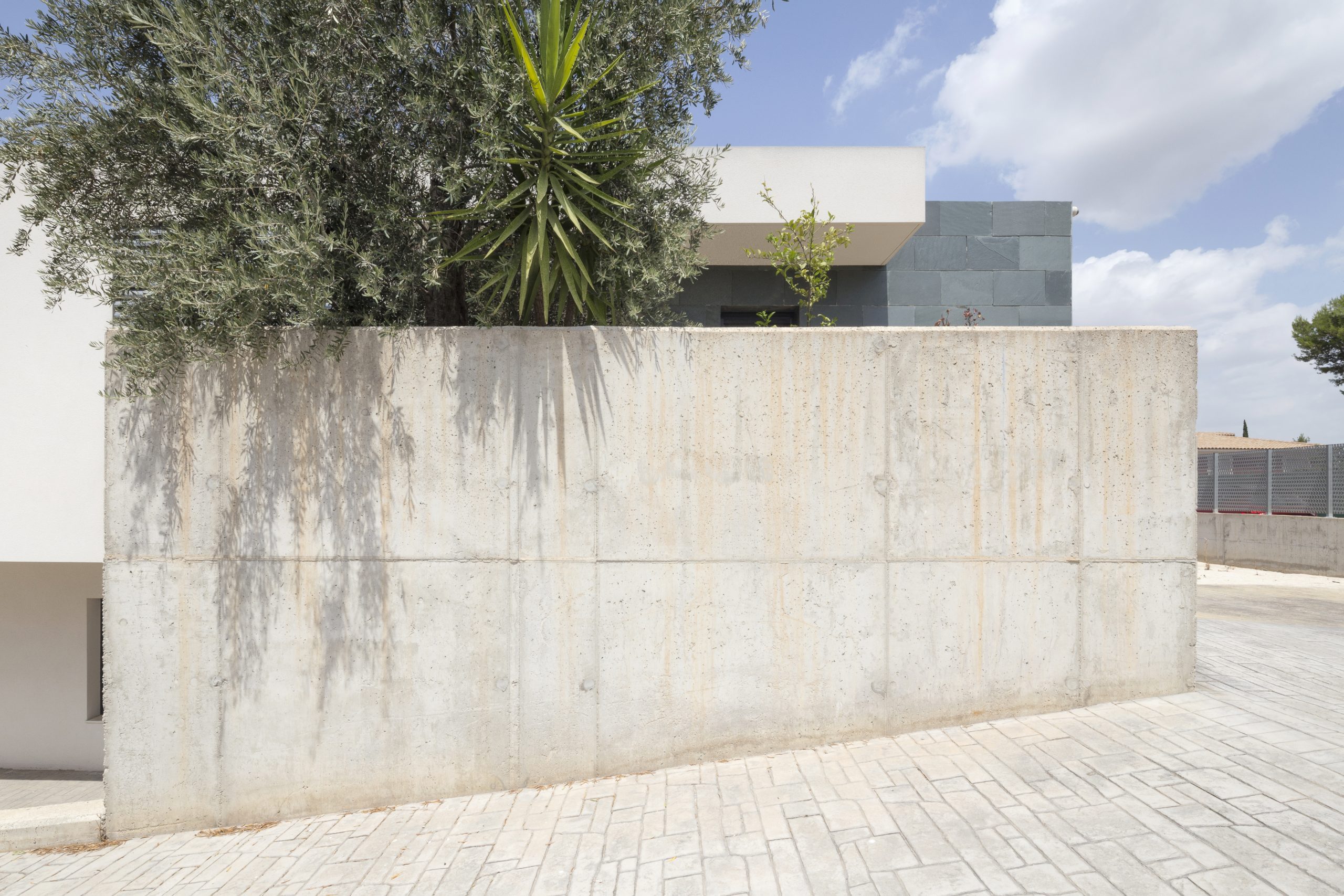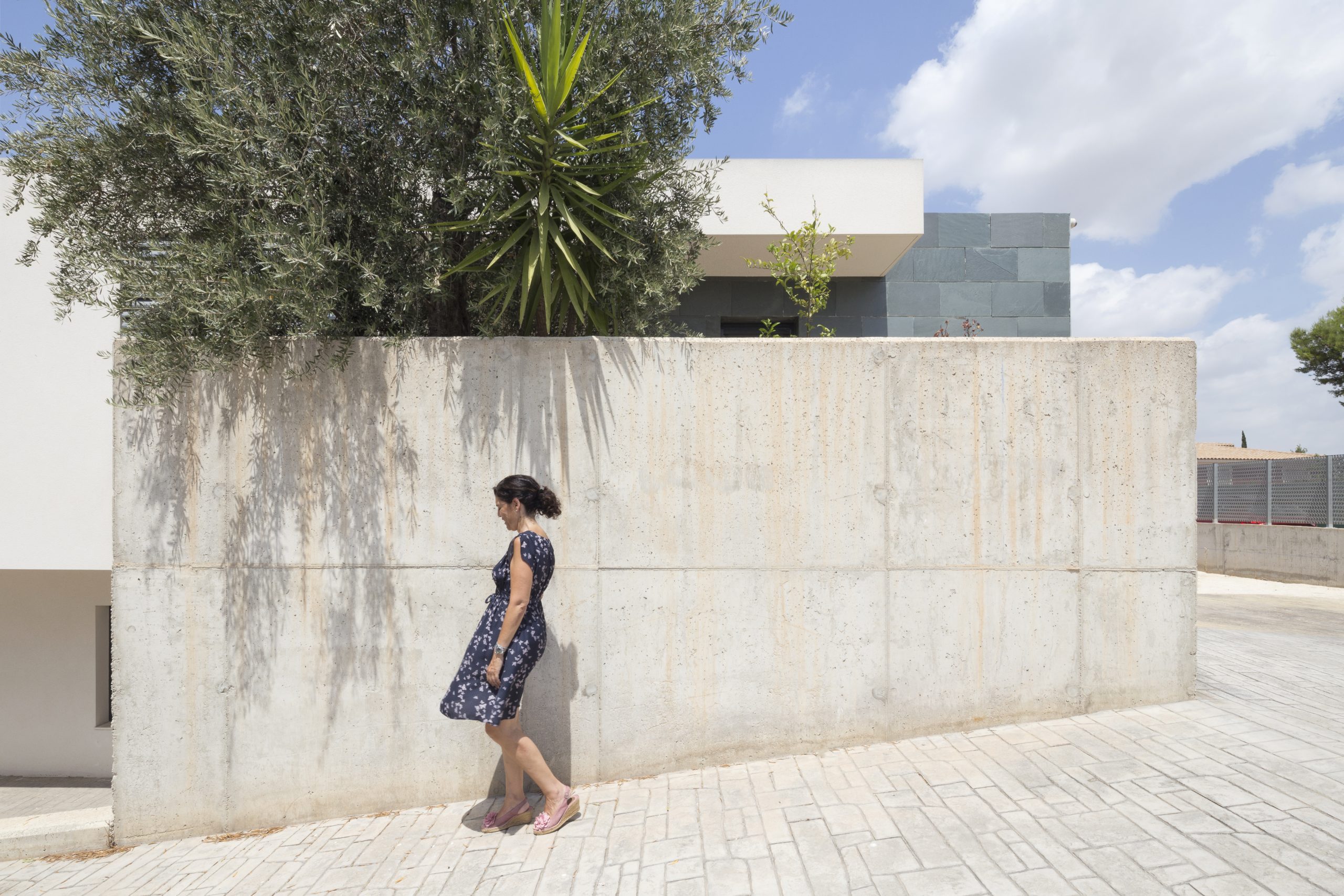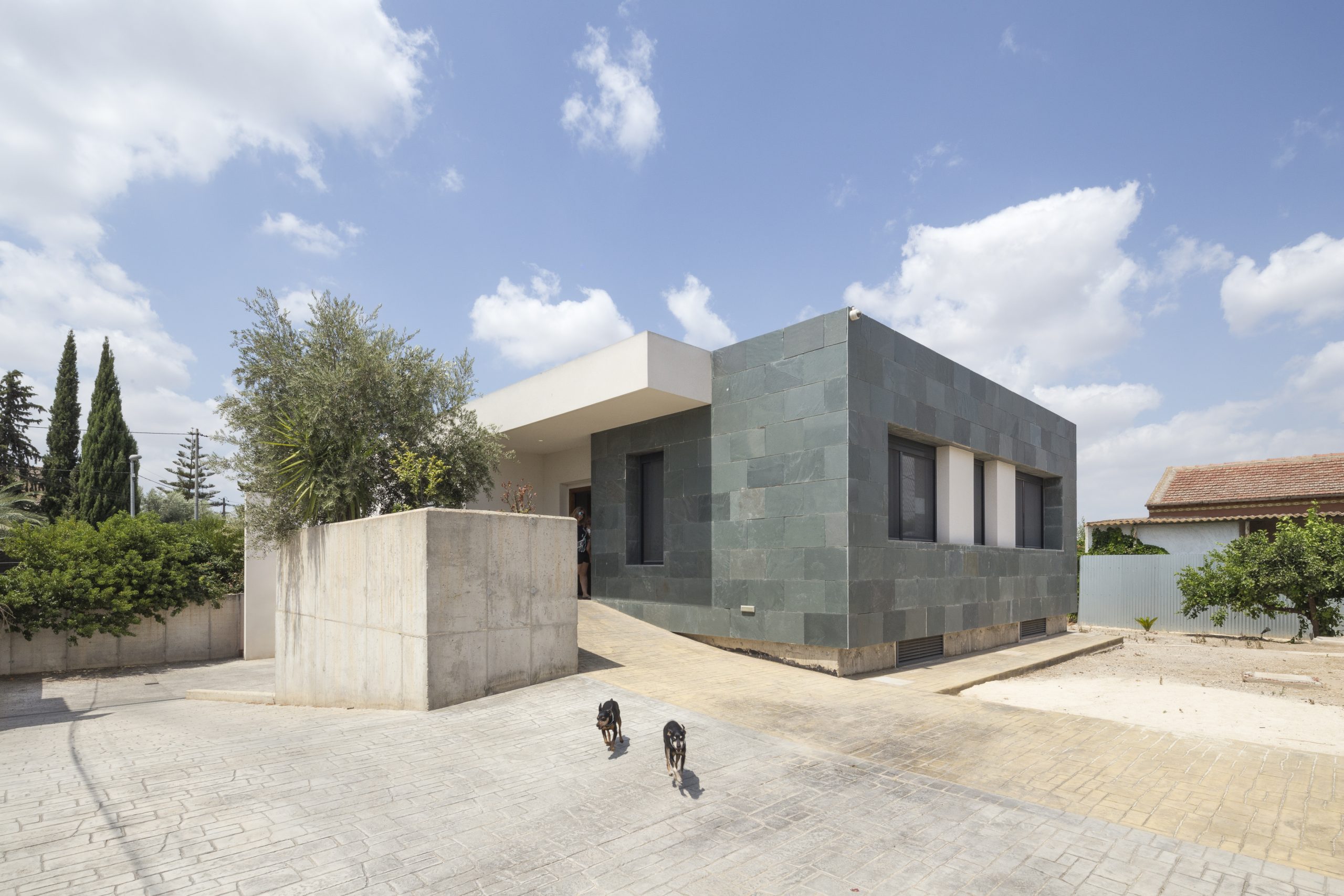 Vivienda unifamiliar aislada en la huerta de Murcia, una caja rectangular de pizarra verde, mortero blanco y hormigón, con un gran porche, donde reunir a la familia y amigos, en compañía de limoneros y buganvillas.