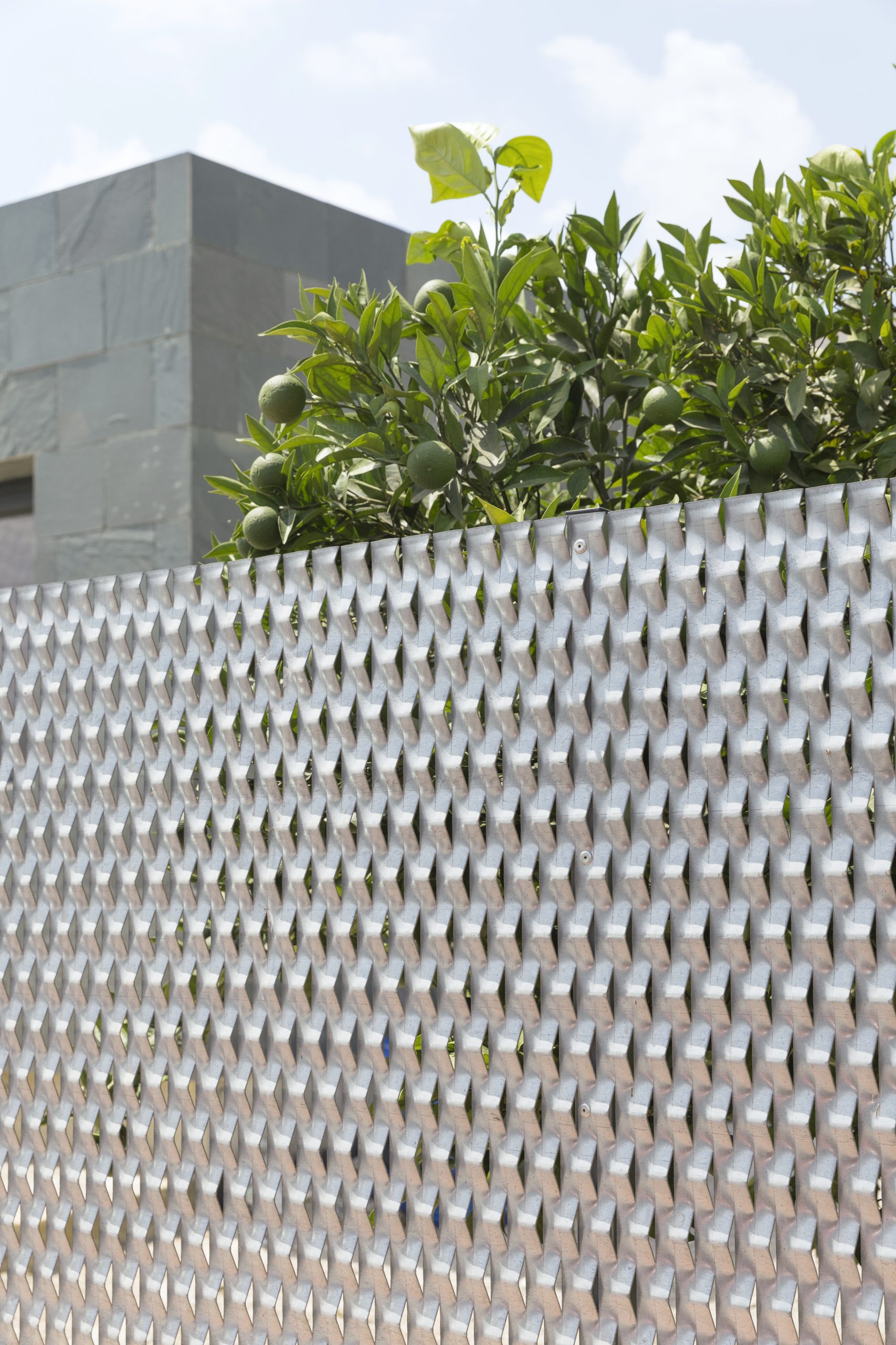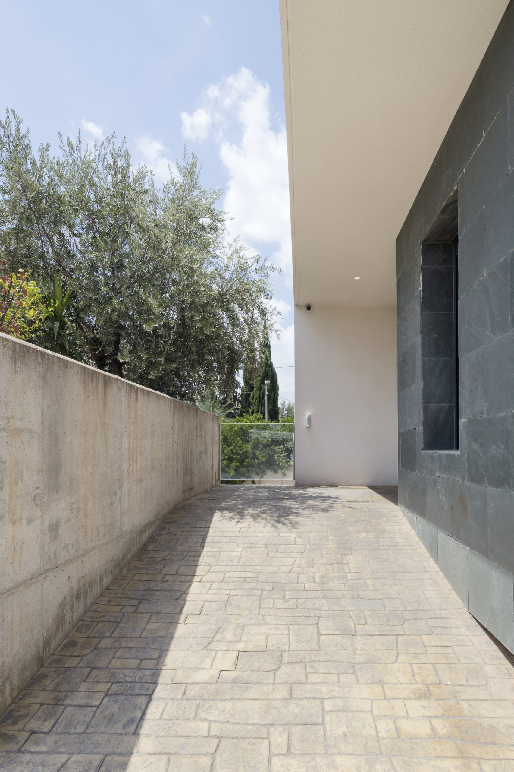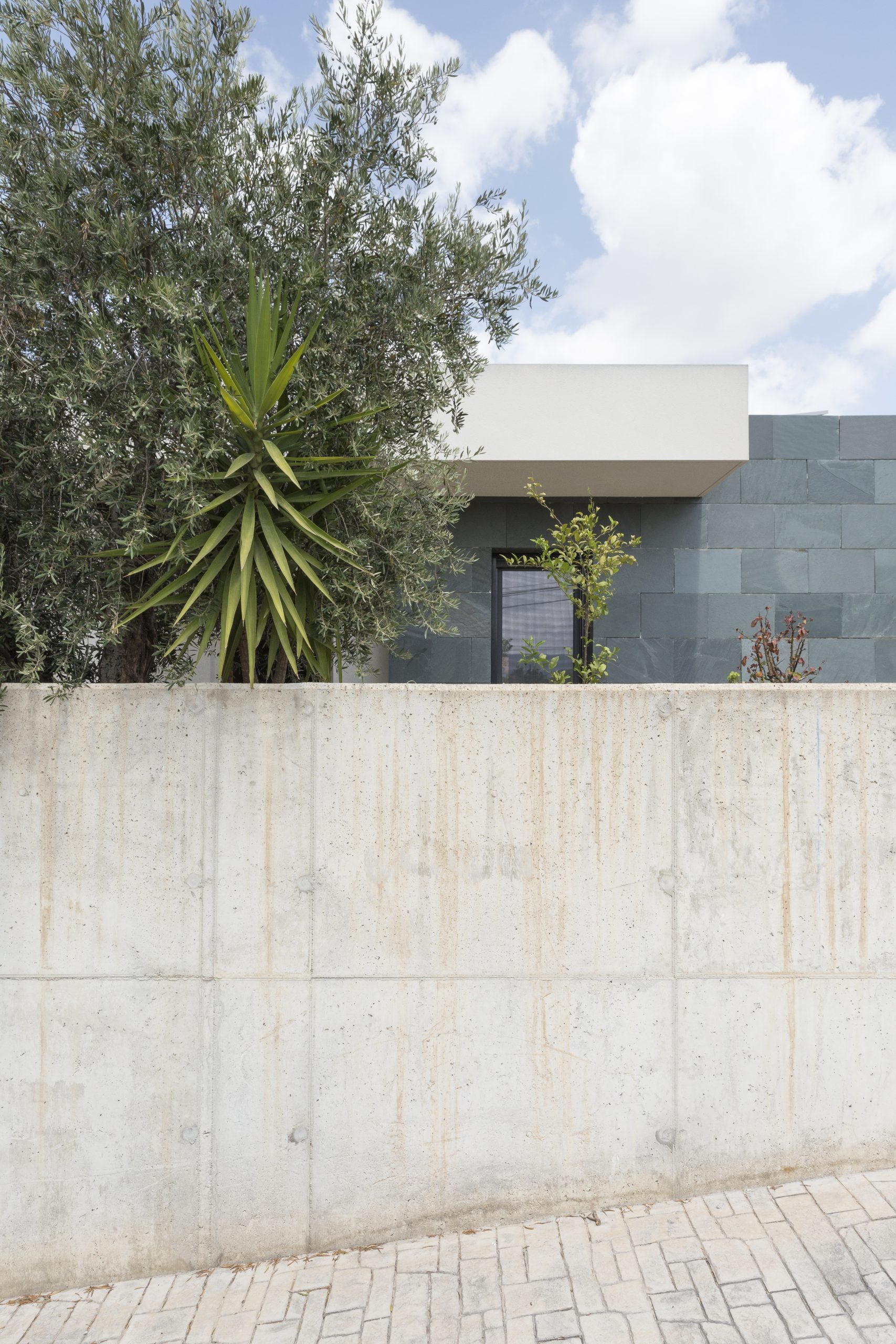 Vivienda unifamiliar aislada en la huerta de Murcia, una caja rectangular de pizarra verde, mortero blanco y hormigón, con un gran porche, donde reunir a la familia y amigos, en compañía de limoneros y buganvillas.
