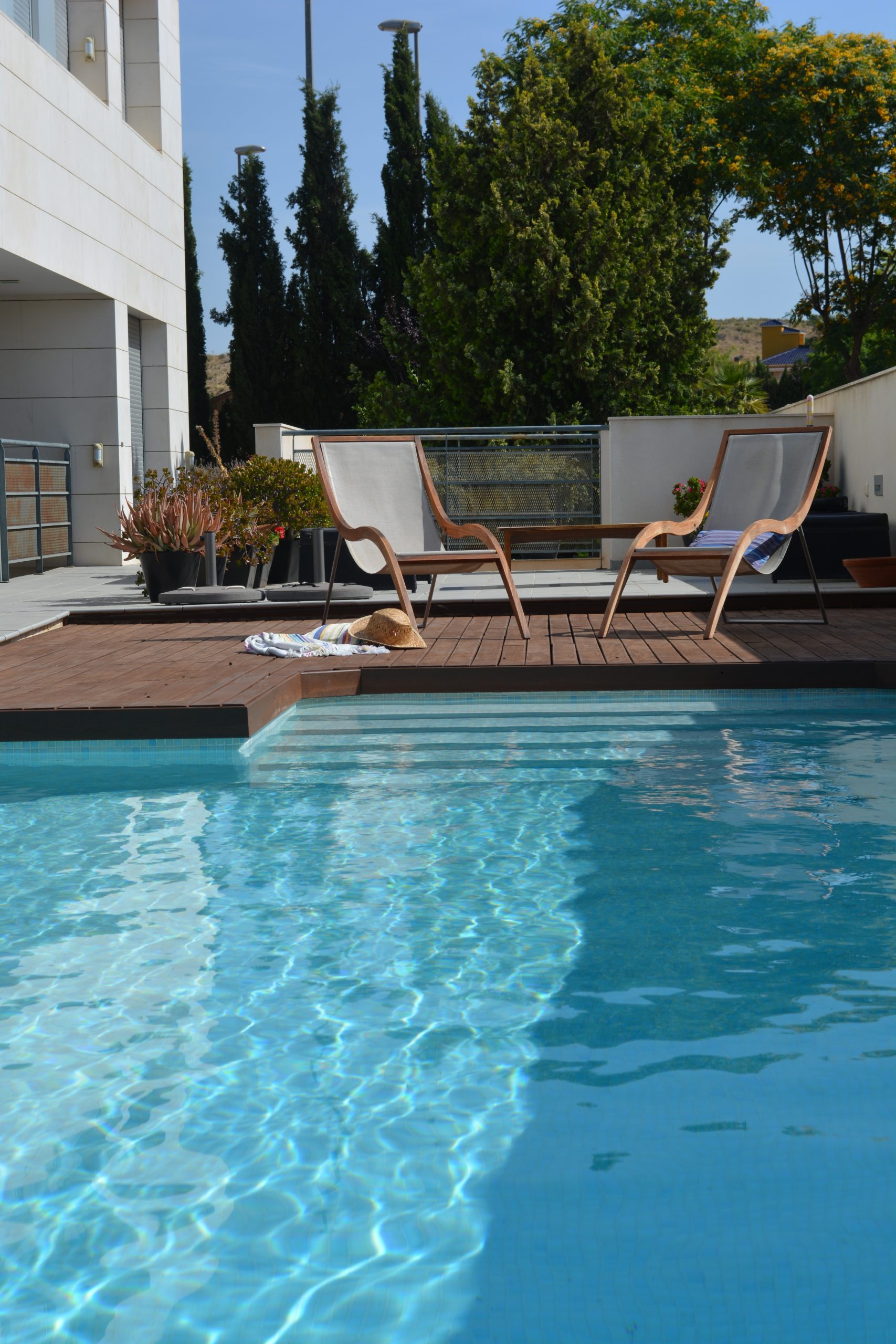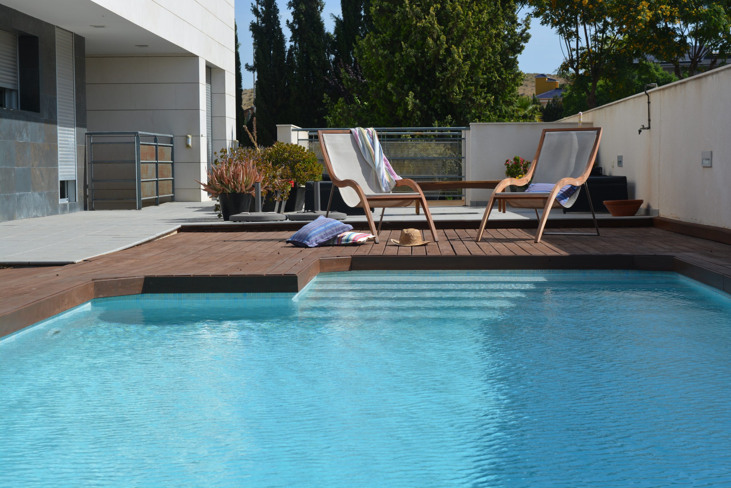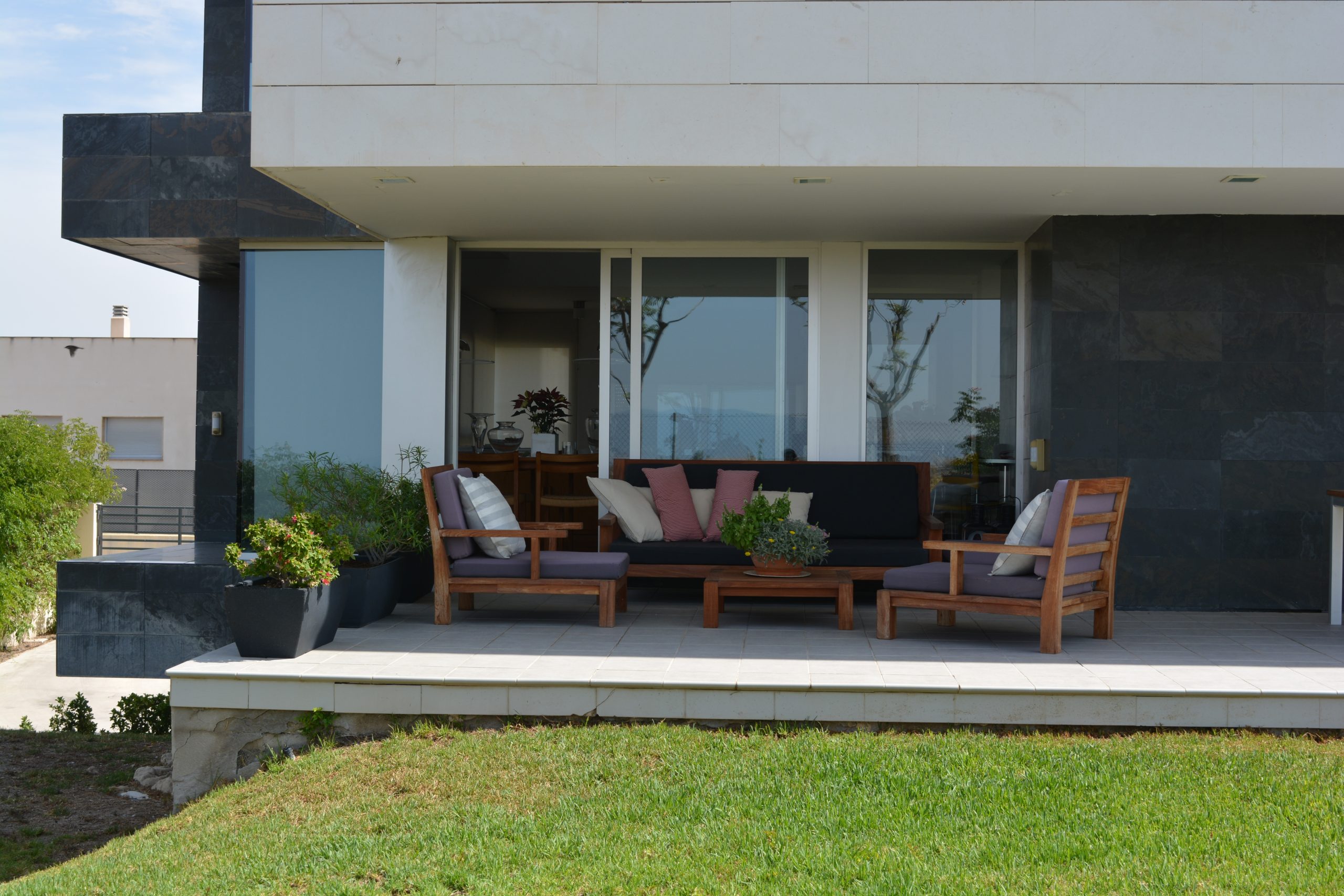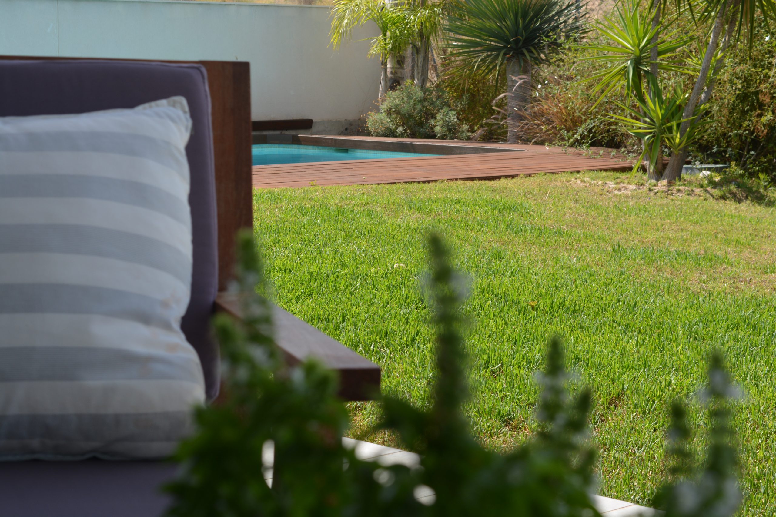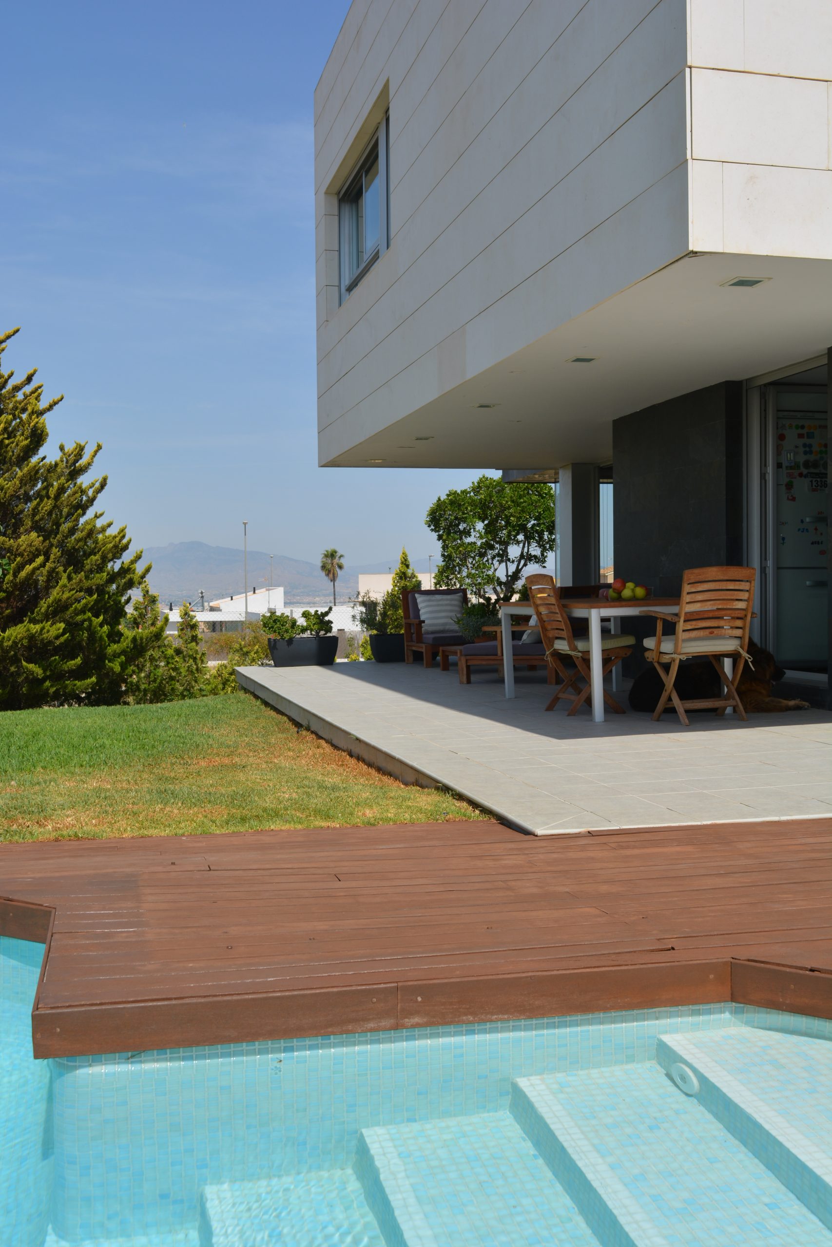 Un gran porche a sur, en la parte trasera de la parcela, une salón, cocina, jardín y piscina, es el estar de verano, fresco y protegido, íntimo y relajado.
